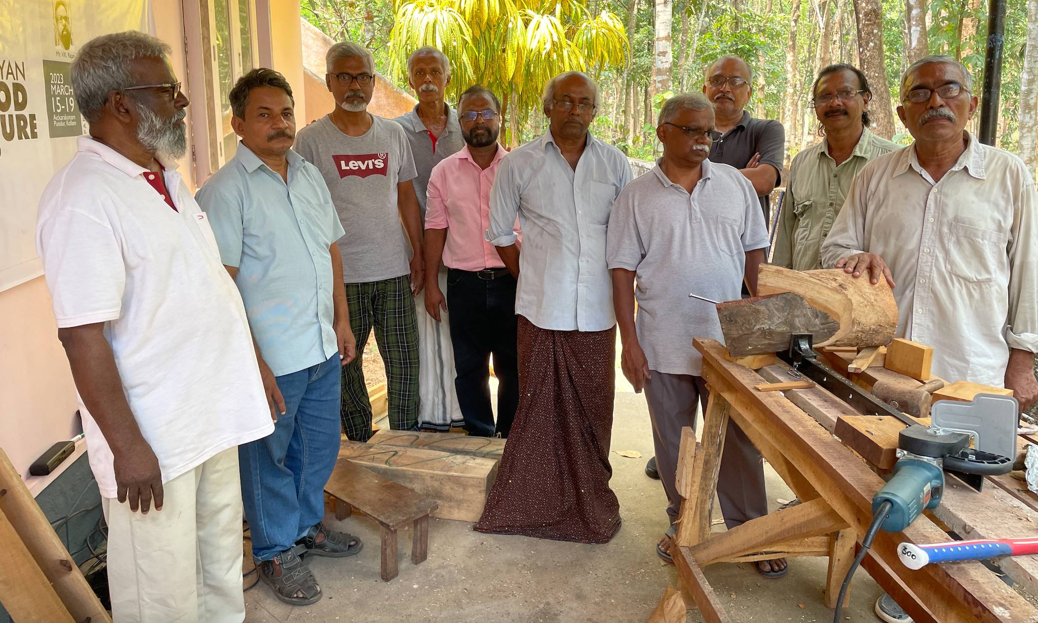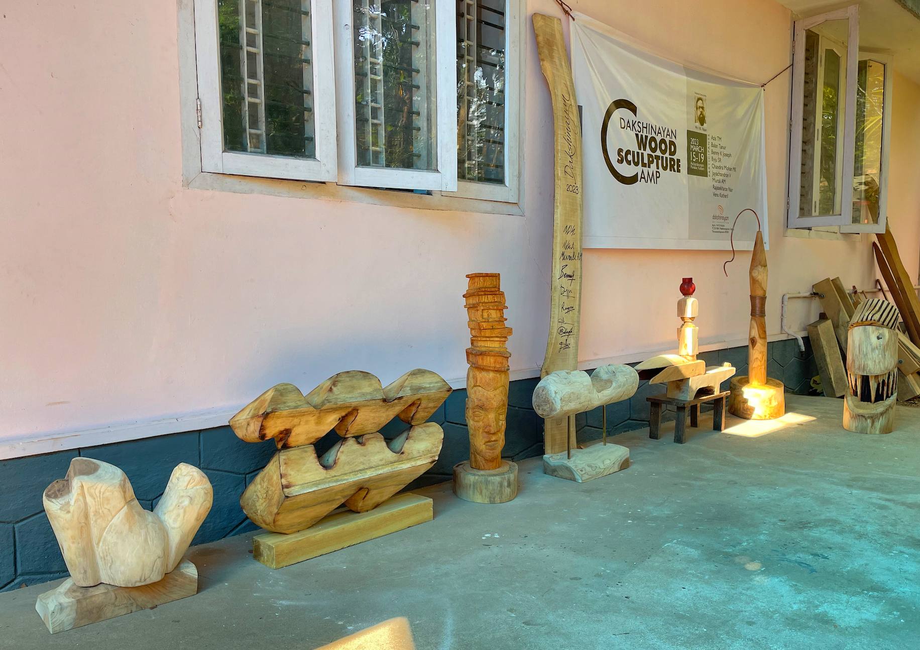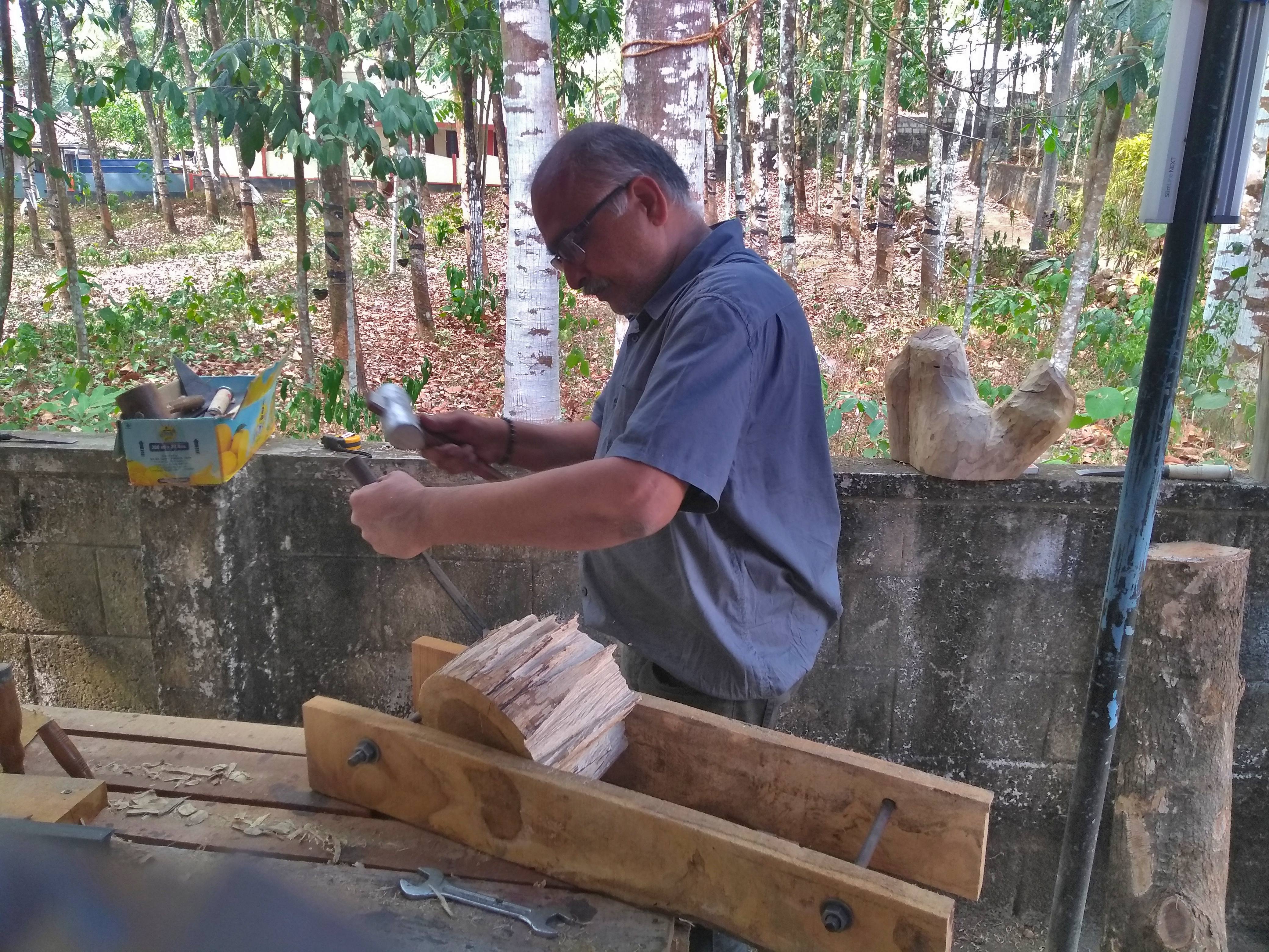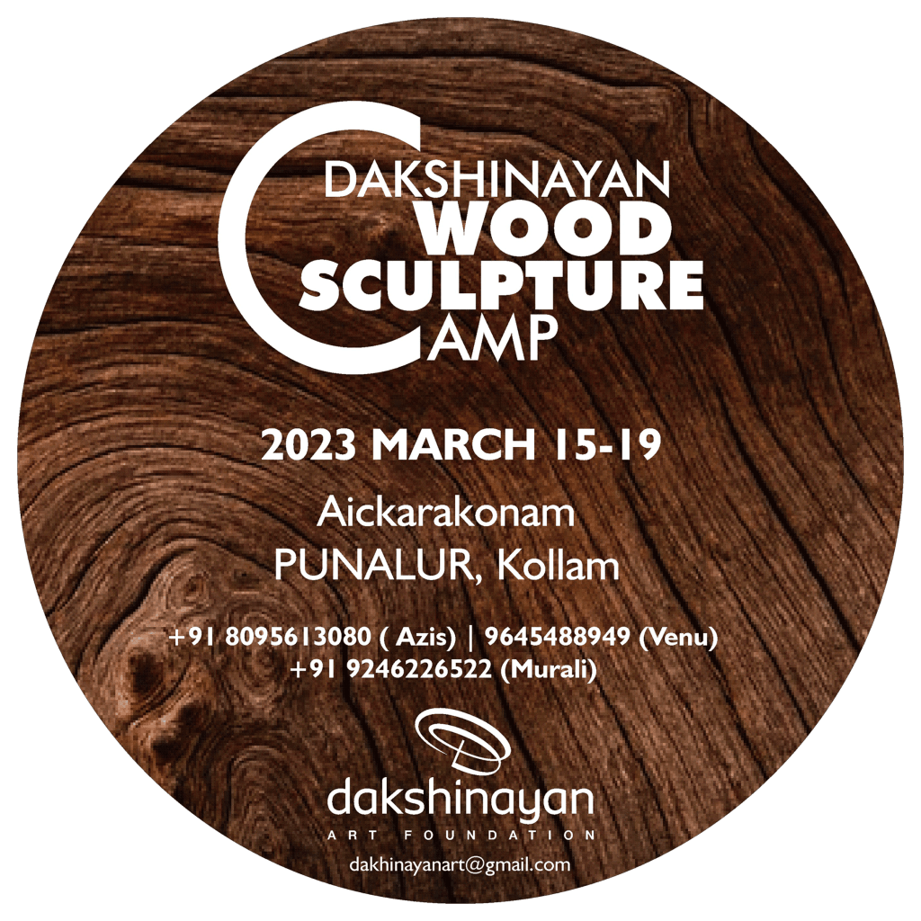 In 2023, our second art camp was held in Punalur, Kerala, amidst its breathtaking natural beauty. Ten artists participated in this camp. It was hosted by Chandramohan M. K. and led by the experienced sculptor V. K. Rajan. The environment was perfect for our chosen medium: wood logs. The artists utilized the wood carving tools offered to the best of our ability to express our diverse artistic inspirations.