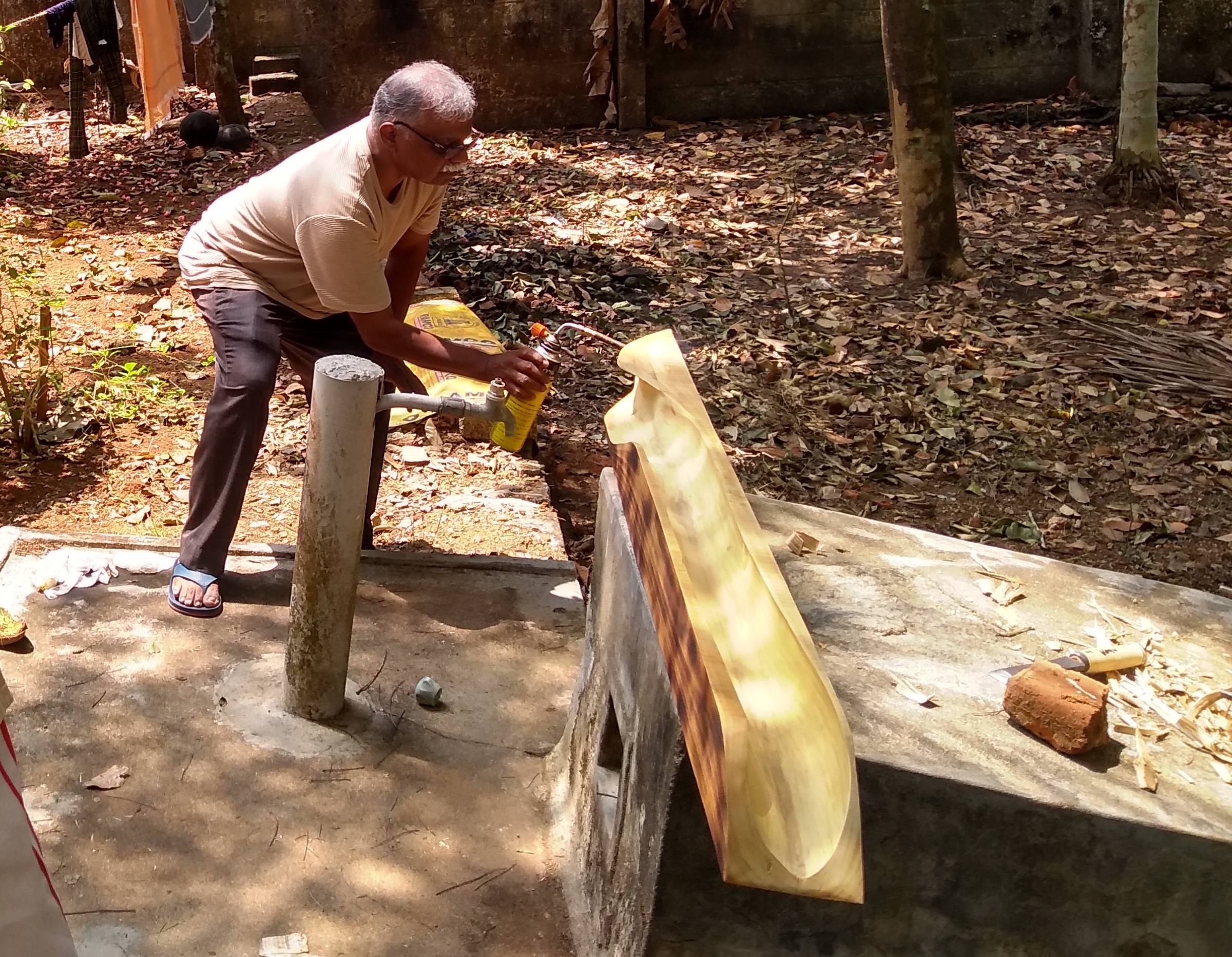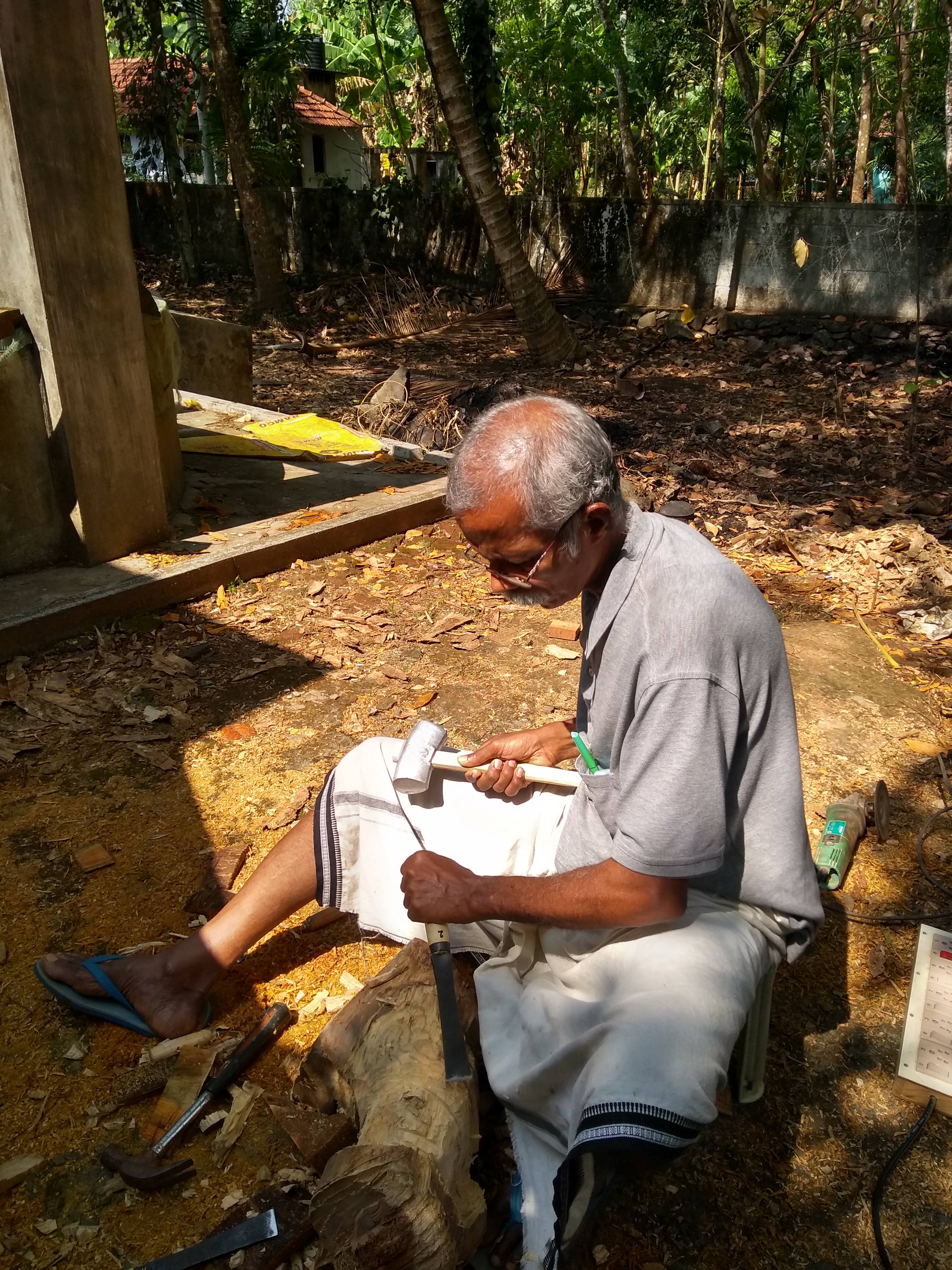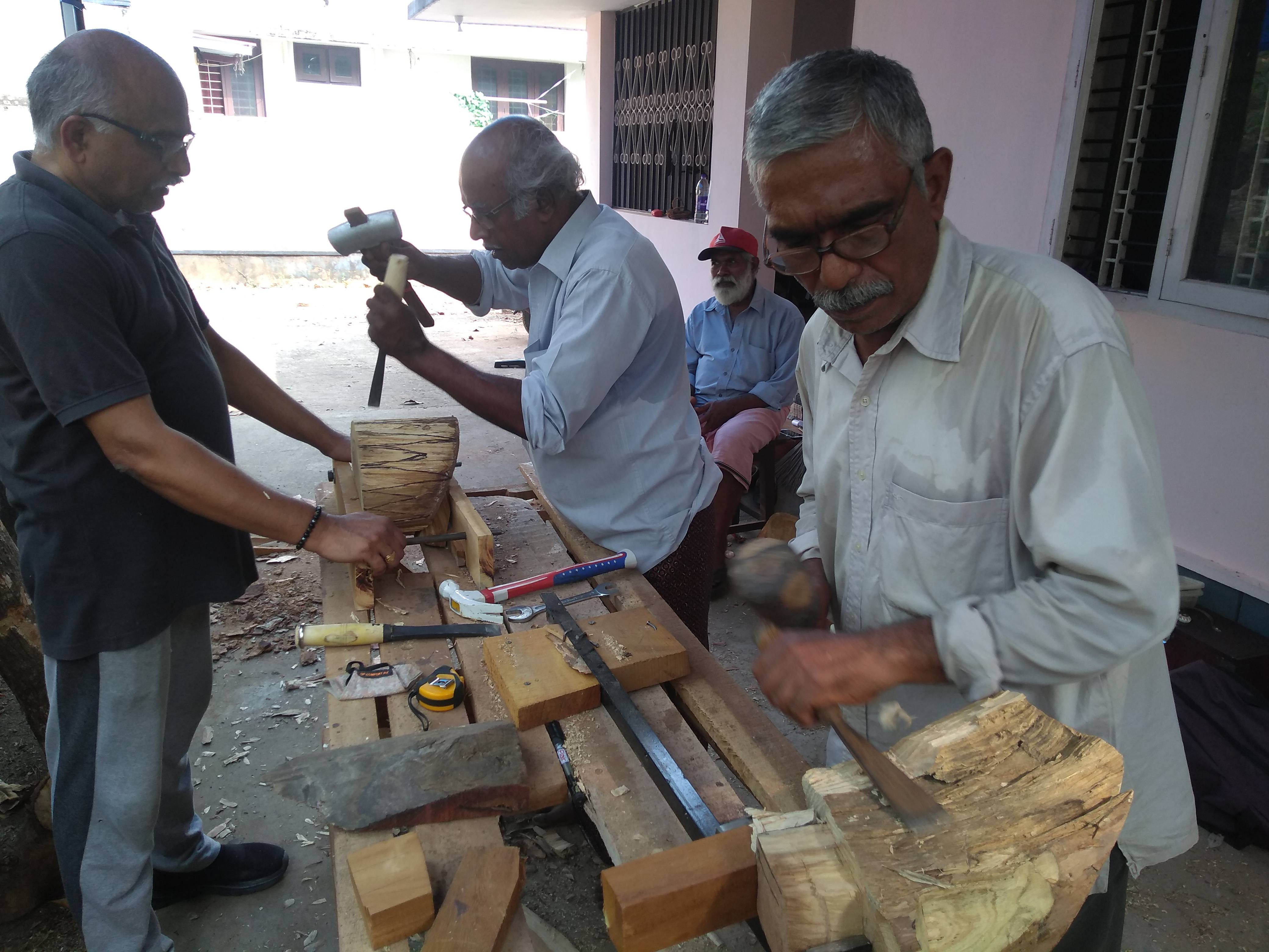 In 2023, our second art camp was held in Punalur, Kerala, amidst its breathtaking natural beauty. Ten artists participated in this camp. It was hosted by Chandramohan M. K. and led by the experienced sculptor V. K. Rajan. The environment was perfect for our chosen medium: wood logs. The artists utilized the wood carving tools offered to the best of our ability to express our diverse artistic inspirations.