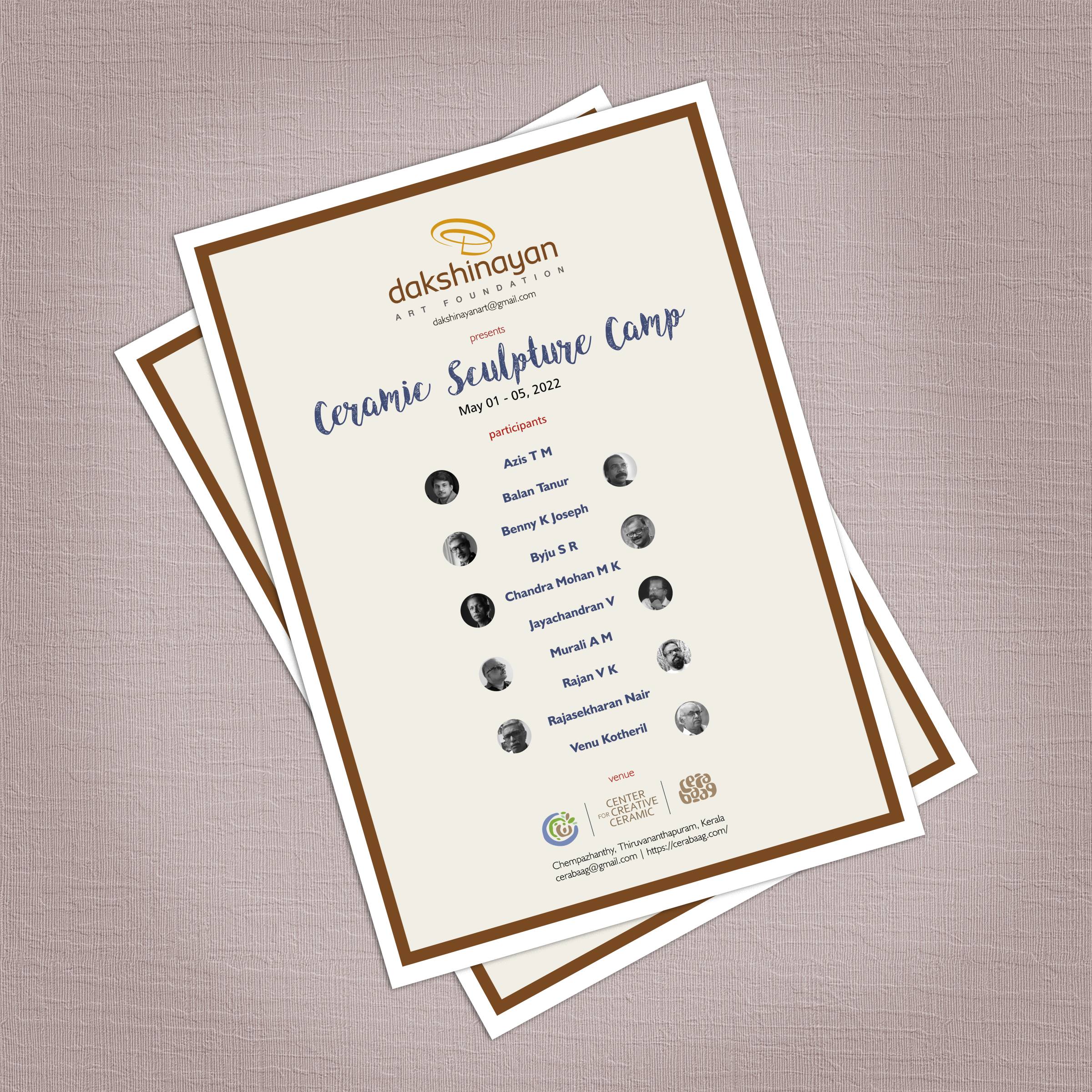 The Dakshinayan Art Foundation was inaugurated with a ceramic art camp in 2022. It was held at an extensively equipped ceramic studio owned by artist Byju SR at Cerrabag, in Chempazhanthy, Thiruvananthapuram. This camp was led by Byju and it was meant for the members of the foundation. For many of us, the ceramic process was unfamiliar, but the spirit of learning infused the camp with energy and made it productive. The nearly week-long workshop was exhilarating, with visits from artist friends, art lovers, and the late Prof. K. C. Chitrabhanu. Each artist was immersed in the creative process and produced a minimum of two works. The pictures from these pieces were made into a 2024 tabletop calendar called the “Dakshinayan Table Top Calendar.”